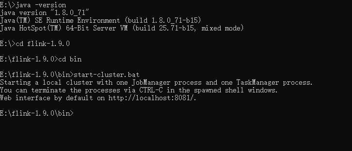 首先启动cmd命令行窗口,进入flink文件夹,运行bin目录下的start-cluster.bat