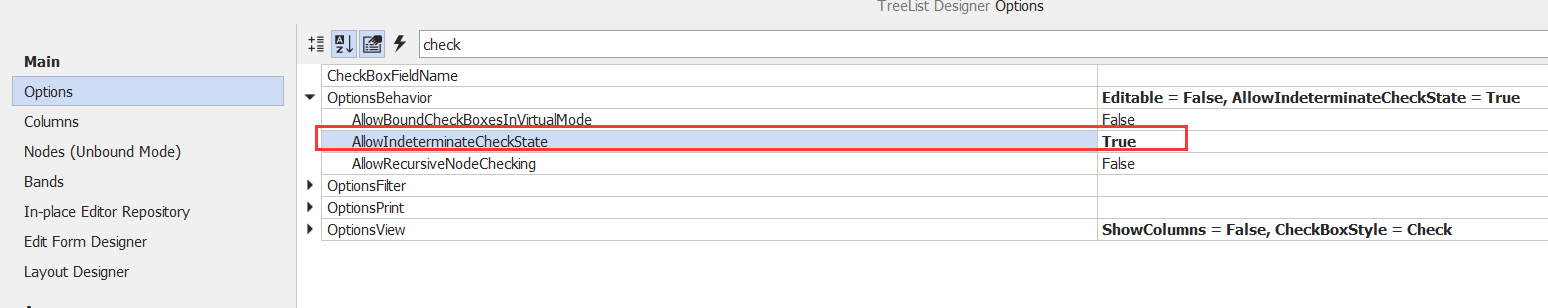 设置TreeList.OptionsBehavior.AllowIndeterminateCheckState = true; //设置节点是否有中间状态,即一部分子节点选中,一部分子节点没有选中