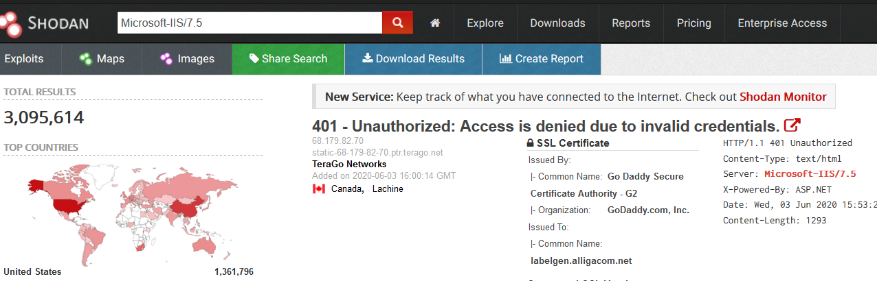 Shodan的参数有很多,这里只介绍简单的几种 hostname:"主机或域名" 如 hostname:"google'' port:"端口或服务" 如 port:"21" ip : "ip地址" 如 ip : "168.205.71.64" net:"IP地址或子网" 如 net:"210.45.240.0/24" vuln :指定漏洞的cve 如 vuln:CVE-2015-8869 但是这个命令最好搭配起来使用,如 country:CN vuln:CVE-2014-0160 os :"操作系统" 如 os:"centOS" isp:"ISP供应商" 如 isp:"China Telecom" product:"操作系统/软件/平台" 如 product:"Apache httpd" version:"软件版本" 如 version:"3.1.6" geo:"经纬度" 如 geo:"39.8779,116.4550" country`:"国家" 如 country:"China" country:"UN" city:"城市" 如 city:"Hefei" org:"组织或公司" 如 org:"google" before/after:"日/月/年" 如 before:"25/09/2017" after:"25/09/2017" asn : "自治系统号码" 如 asn:"AS2233"