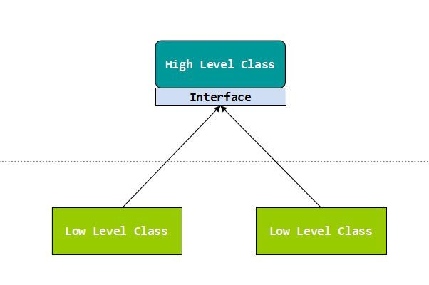 在这个图中,我们发现高层模块定义了接口,将不再直接依赖于低层模块,低层模块负责实现高层模块定义的接口。这样,当有新的低层模块实现时,不需要修改高层模块的代码。