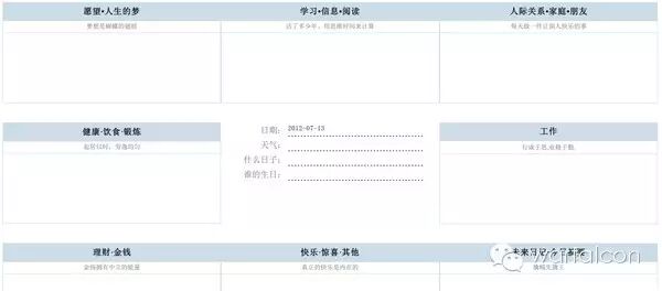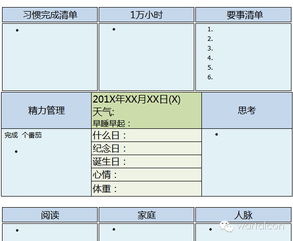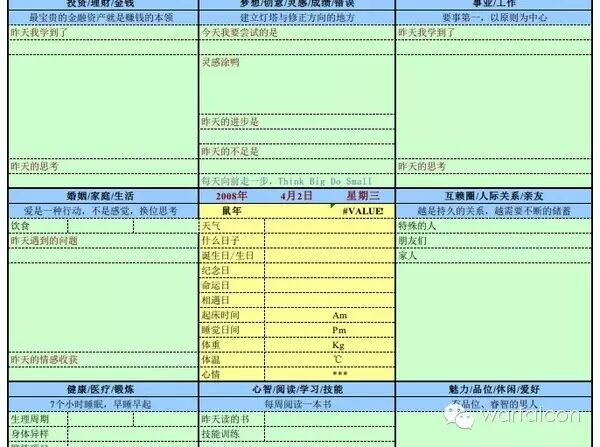 象晨间日记这种东西,一般是根据个人情况做调整,每个人的模板都会有些不同。 记录时别太复杂,同时最好包括四个方面的内容:身体的、情感的(家庭)、思想的和精神(梦想、目标),以前还包括财务,后来把财务这部分用其它工具来记录。
