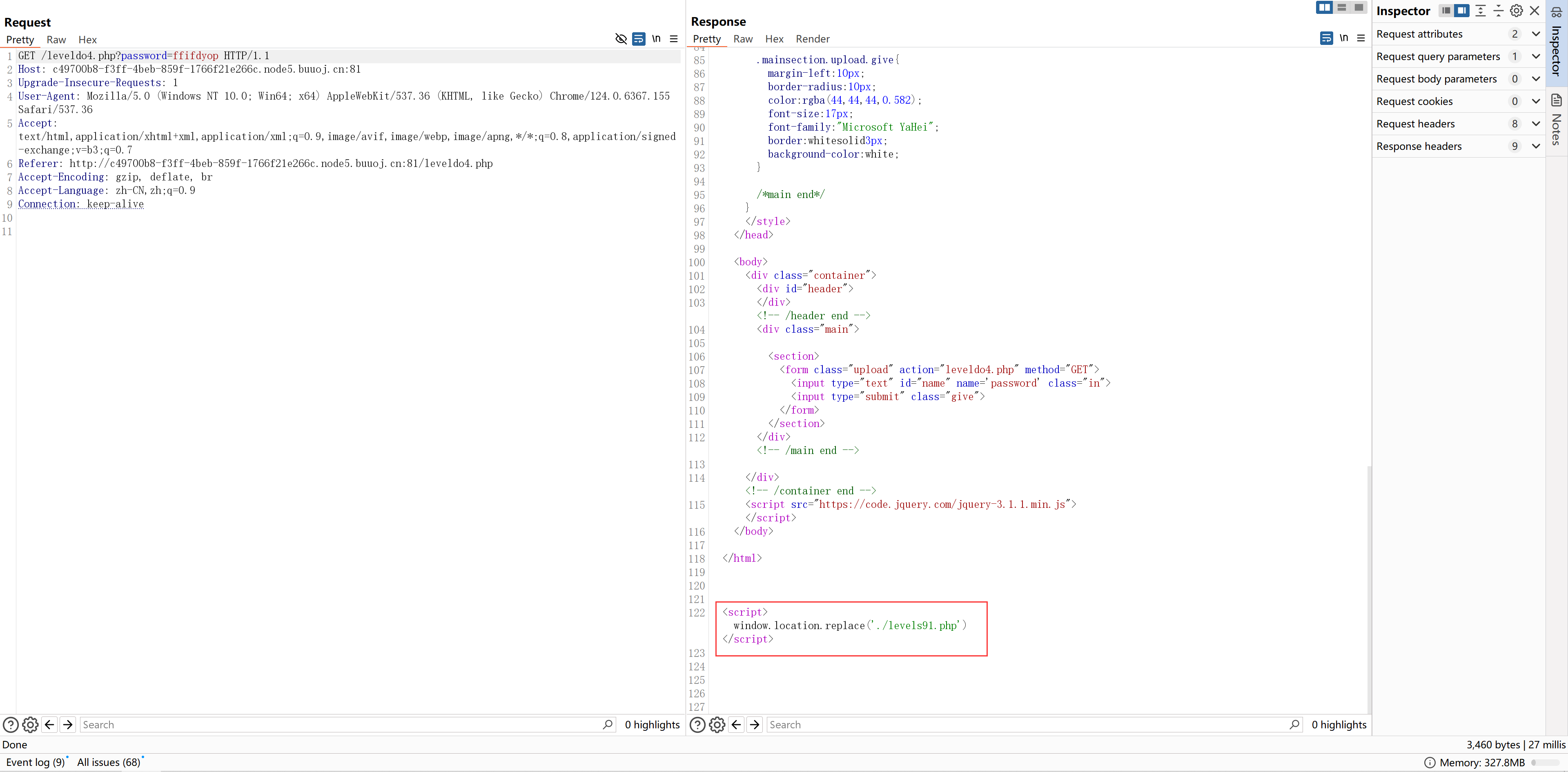题目重定向到 "levels91.php",响应包如下。