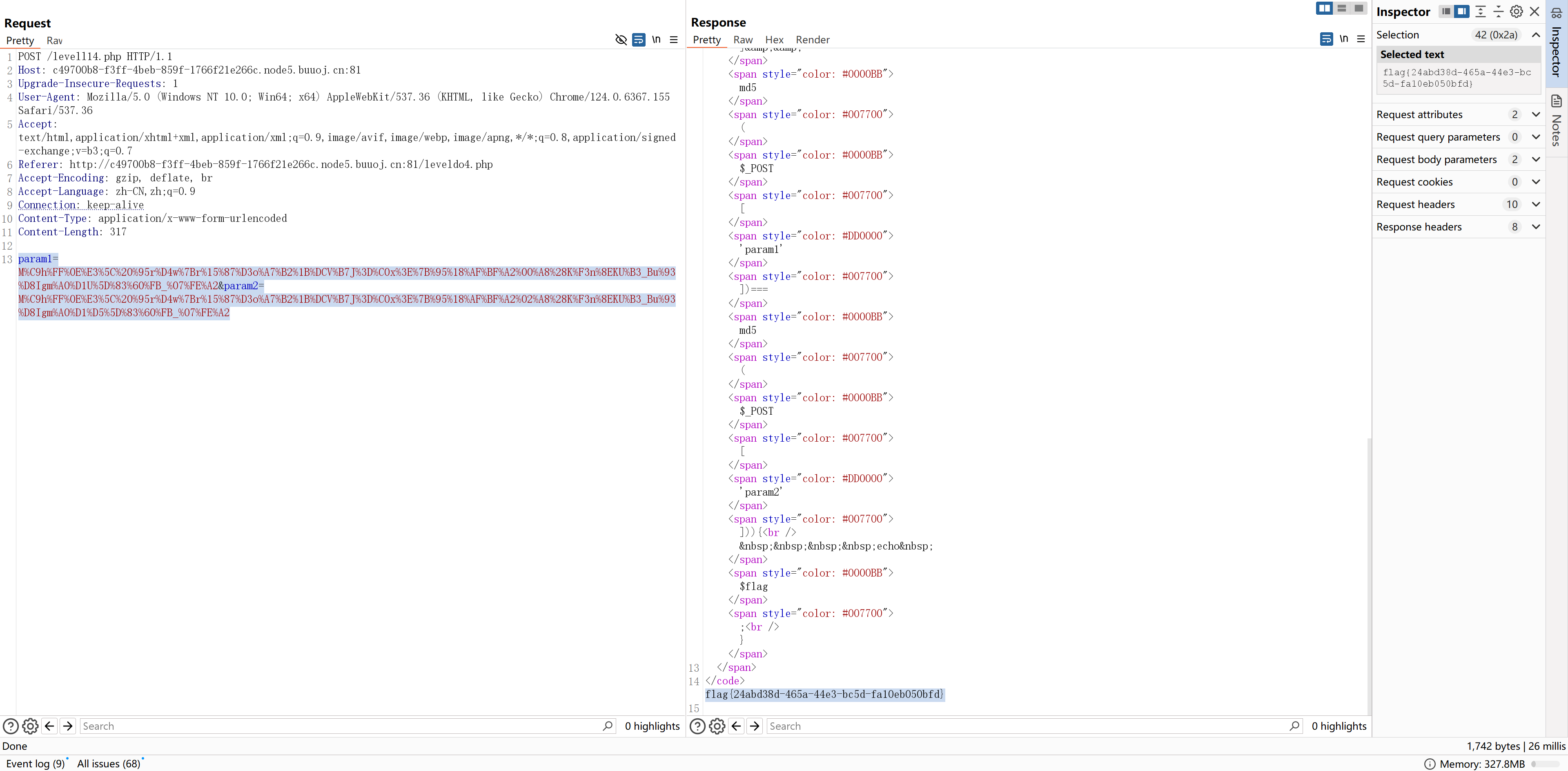 可以发现,在 HTTP 标头中存在一个 "hint",即:select * from 'admin' where password=md5($pass,true)。