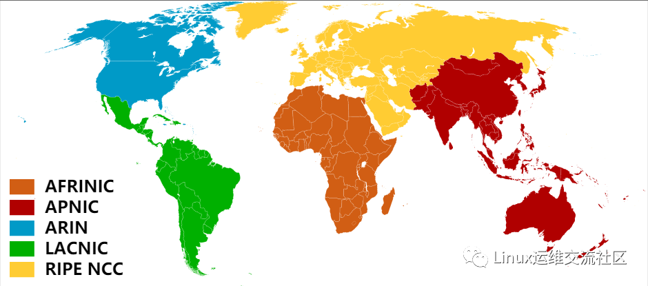 全球IP地址块被IANA(Internet Assigned Numbers Authority)分配给全球三大地区性IP地址分配机构,它们分别是: