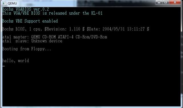 里面用了一个叫qemu的软件来模拟pc启动这个软盘镜像。运行起来是这样的:
