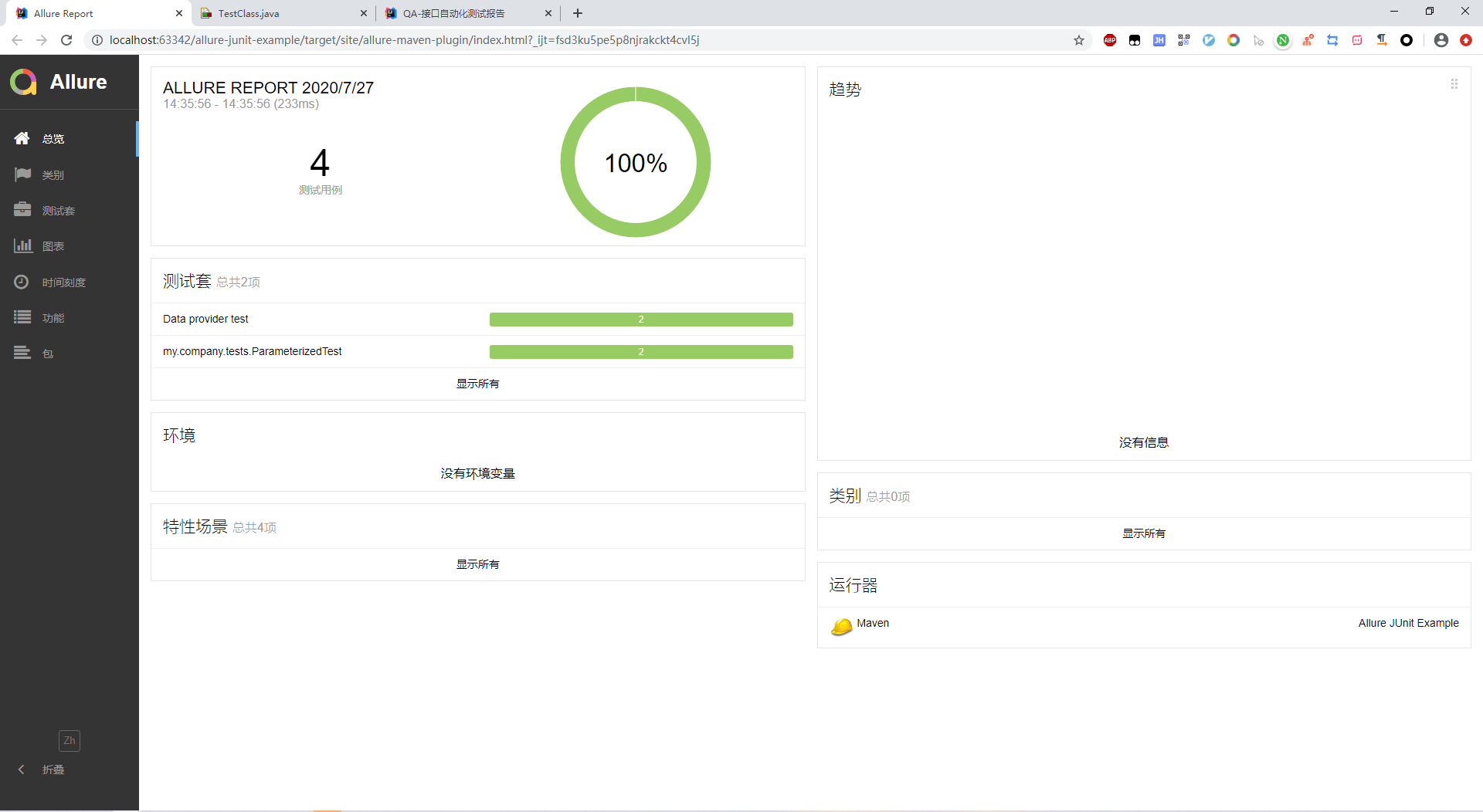 以离线报告为例,执行成功后,会在 target/site/allure-maven-plugin 目录下看到生成的报告,打开 index.html ,使用Idea的浏览器访问,或者直接拖动至浏览器窗口,访问即可