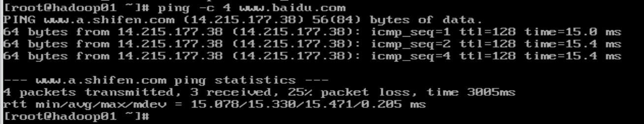 自动获取IP地址后,测试一下是否可以联网(centos能联网的前提是你的物理机可以联网)。输入ping -c 4 www.baidu.com。