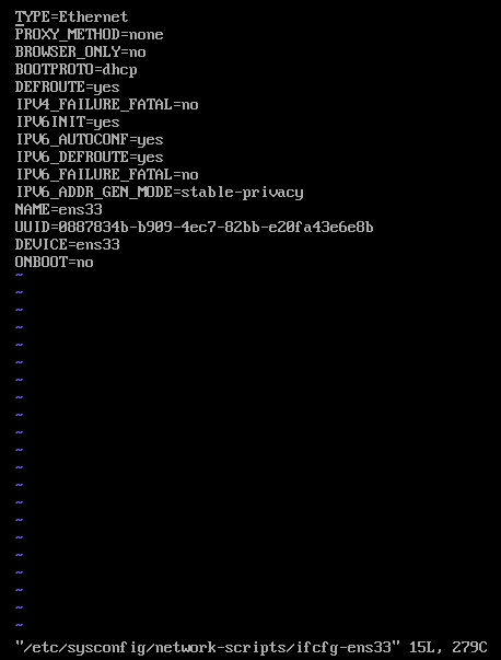 回车后按字母i键,就可以编辑了。我们需要修改的内容有,将ONBOOT=no改为ONBOOT=yes,将BOOTPROTO=dhcp改为BOOTPROTO=static,并增加如下字符