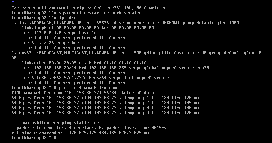 5.然后查看一下ip地址ip addr,再测试一下网络的连通性ping -c 4 www.baidu.com。