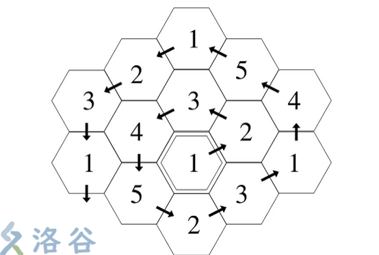 棋盘是由许多个六边形构成的,共有 \(5\) 种不同的六边形编号为 \(1\) 到 \(5\) ,棋盘的生成规