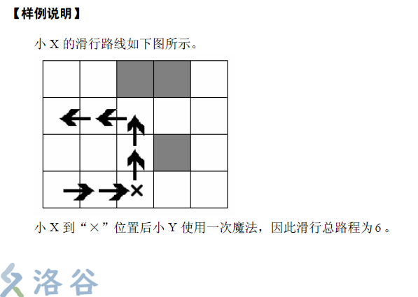 不妨认为舞台是一个 \(n\) 行 \(m\) 列的矩阵,矩阵中的某些方格上堆放了一些装饰物,其他的则是空地。小X 可以在空地上滑动,但不能撞上装饰物或滑出舞台,否则表演就失败了。