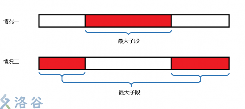 把环先当做一个序列处理。从考虑两种情况,第一种情况最大子段在序列中,即最大字段不跨越第 \(n\) 盆花和第 \(1\) 盆花;第二种情况最大子段不在序列中,即最大字段不跨越第 \(n\) 盆花和第 \(1\) 盆花。