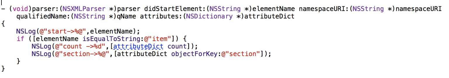 a.寻找节点元素,elementName是找到的元素的名称(如:menus,item,name),如何这个节点里面设有其他属性,则在attributeDict返回(如:item里面的section属性)