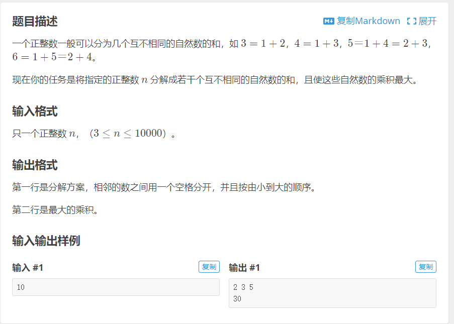 首先这道题求:整数n分成若干个互不相同的自然数之和,使这些自然数的乘积最大