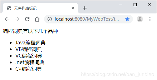 无序列表是在每个列表项的前面添加一个圆点符号。通过符号<ul>可以创建一组无序列表,其中每个列表项以<li>表示。