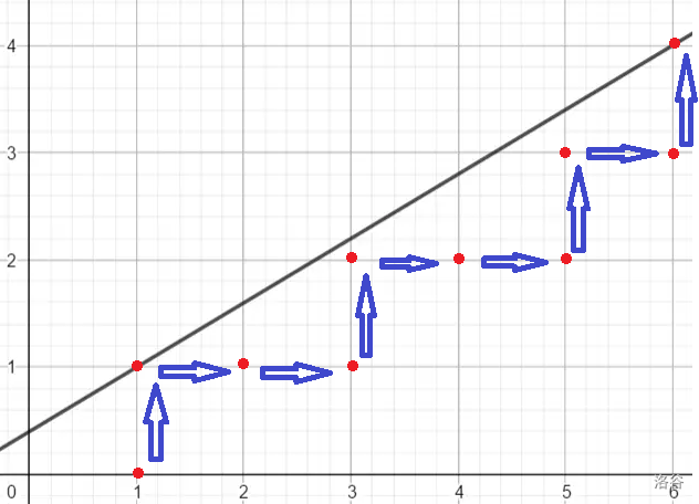 - 否则,算整点个数可以用长方形点数减去上方个数,而上方点个数可以通过交换横纵轴来计算:\(y=\frac{a}{c}x+\frac{b}{c}\) 交换横纵轴后为 \(y=\frac{c}{a}x-\frac{b}{a}\)。