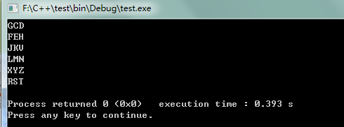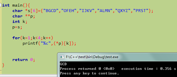 1 int main(){ 2 char *s[6]={"BGCD","OFEH","IJKV","ALMN","QXYZ","PRST"}; 3 char **p; 4 int k,j; 5 p=s; 6 for(j=0;j<6;j++){ 7 for(k=1;k<4;k++) 8 printf("%c",(*(p+j))[k]); 9 printf("\n"); 10 } 11 return 0; 12 }