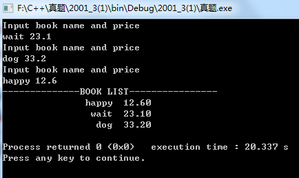 1 #include <stdio.h> 2 #include <stdlib.h> 3 #define NUM 3//由于运行输入方便 所以将#define NUM 100 改成#define NUM 3 4 5 struct book{ 6 char name[20]; 7 float price; 8 }; 9 10 void sortbook(struct book term,struct book *pbook,int count){ 11 int k; 12 struct book *q,*pend=pbook; 13 for(k=0;k<count;k++,pend++);//用于移动pend到有序pbook数组的末端 14 15 for(;pbook<pend;pbook++) 16 if(pbook->price>term.price)//用于找插放的位置 这个条件说明是按照price从小到大排序 17 break; 18 19 for(q=pend-1;q>=pbook;q--) 20 *(q+1)=*q; 21 *pbook=term; 22 } 23 24 void printbook(struct book *pbook){ 25 printf("%20s %6.2f\n",pbook->name,pbook->price); 26 } 27 int main() 28 { 29 struct book term,books[NUM]; 30 int count; 31 32 for(count=0;count<NUM;count++){ 33 printf("Input book name and price\n"); 34 scanf("%s%f",term.name,&term.price); 35 sortbook(term,books,count); 36 } 37 printf("--------------BOOK LIST----------------\n"); 38 for(count=0;count<NUM;count++){ 39 printbook(&books[count]); 40 } 41 return 0; 42 }