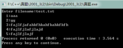1 #include <stdio.h> 2 #include <stdlib.h> 3 #include<string.h> 4 int main() 5 { 6 char s[20],filename[20]; 7 int flag=1,i=0,t=2; 8 FILE *fp; 9 printf("Enter filename:"); 10 gets(filename); 11 if((fp=fopen(filename,"r"))==NULL){ 12 printf("File open error!\n"); 13 exit(0); 14 } 15 16 while(!feof(fp)){ 17 while(fgets(s,20,fp)!=NULL){ 18 if(flag) 19 printf("%3d:%s",++i,s); 20 else 21 printf("%s",s); 22 if(strlen(s)!=19||s[18]=='\n') 23 flag=1; 24 else 25 flag=0; 26 } 27 } 28 fclose(fp); 29 return 0; 30 }