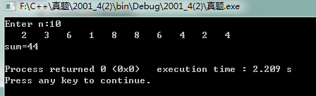 1 #include <stdio.h> 2 #include <stdlib.h> 3 #define N 100 4 int a[N+1]; 5 void list_sum(int n){ 6 int count=2;//已经有两项了 7 int result,i; 8 int sum=0; 9 a[0]=2; 10 a[1]=3; 11 while(n>2&&count<n){ 12 result=a[count-1]*a[count-2]; 13 if(result>=10){ 14 a[count]=result/10; 15 a[count+1]=result%10; 16 count+=2; 17 }else{ 18 a[count]=result; 19 count++; 20 } 21 } 22 23 for(i=0;i<n;i++){ 24 printf("%4d",a[i]); 25 sum+=a[i]; 26 } 27 printf("\nsum=%d\n",sum); 28 } 29 30 int main() 31 { 32 int n; 33 printf("Enter n:"); 34 scanf("%d",&n); 35 list_sum(n); 36 return 0; 37 }