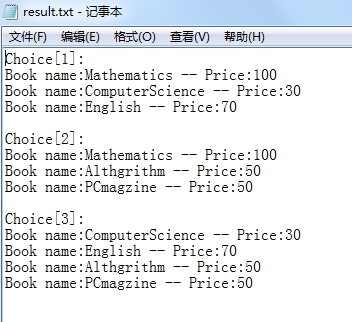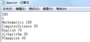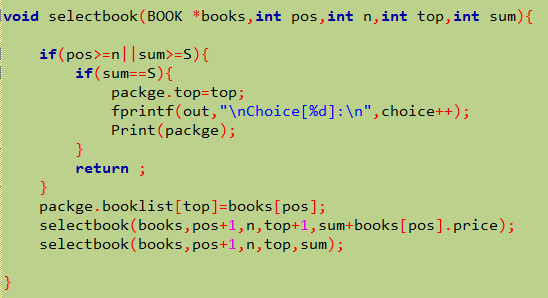 1 #include <stdio.h> 2 #include <stdlib.h> 3 #define MAXN 31 4 5 6 typedef struct book{ 7 char name[20]; 8 int price; 9 }BOOK; 10 11 typedef struct stack{ 12 int top; 13 BOOK booklist[MAXN]; 14 }BOOKSTACK; 15 16 void sortbook(BOOK *books,int n); 17 void selectbook(BOOK *books,int pos,int n,int top,int sum); 18 BOOK Findcon(BOOK *books,int price,int n);//在books中查找出价格为x的书籍,并且返回这本书 19 20 void Push_stack(BOOKSTACK* package,BOOK a_book,int *top ); 21 int S,N;//带了S元 在N本中选取M本 22 int choice=1; 23 BOOKSTACK packge;//用于存放选择的书 24 FILE *in,*out; 25 int main() 26 { 27 28 BOOK books[MAXN]; 29 30 int i; 31 if((in=fopen("data.txt","r"))==NULL){ 32 printf("Cannot open the %s.\n","data.txt"); 33 exit(0); 34 } 35 36 if((out=fopen("result.txt","w"))==NULL){ 37 printf("Cannot open the %s.\n","result.txt"); 38 exit(0); 39 } 40 41 fscanf(in,"%d%d",&S,&N); 42 43 for(i=0;i<N;i++) 44 fscanf(in,"%s%d",books[i].name,&books[i].price); 45 46 for(i=0;i<N;i++) 47 printf("%s%4d\n",books[i].name,books[i].price); 48 sortbook(books,N); 49 selectbook(books,0,N,0,0); 50 fclose(in);fclose(out); 51 printf("Finshed!\nThe results are displayed in \"result.txt\" .\n"); 52 return 0; 53 } 54 55 void selectbook(BOOK *books,int pos,int n,int top,int sum){ 56 57 if(pos>=n||sum>=S){ 58 if(sum==S){ 59 packge.top=top; 60 fprintf(out,"\nChoice[%d]:\n",choice++); 61 Print(packge); 62 } 63 return ; 64 } 65 packge.booklist[top]=books[pos]; 66 selectbook(books,pos+1,n,top+1,sum+books[pos].price); 67 selectbook(books,pos+1,n,top,sum); 68 69 } 70 71 72 void Print(BOOKSTACK packge){ 73 int i; 74 int len=packge.top; 75 for(i=0;i<len;i++){ 76 fprintf(out,"Book name:%s -- Price:%d\n",packge.booklist[i].name,packge.booklist[i].price); 77 } 78 fprintf(out,"\n"); 79 } 80 81 void sortbook(BOOK *books,int n){ 82 int i,j,t;//用选择排序法从大到小排 83 BOOK temp; 84 for(i=0;i<n-1;i++){ 85 t=i; 86 for(j=i+1;j<n;j++){ 87 if(books[t].price<books[j].price) 88 t=j; 89 } 90 if(t!=i){ 91 temp=books[i]; 92 books[i]=books[t]; 93 books[t]=temp; 94 } 95 96 } 97 }