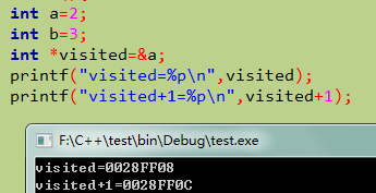 注意不能写成*visited++,由于*和++同一优先级 而结合方向是自右向左的 所以先visited++ 由于++是后置所以visited++表达式值为visited 再做*visited得到值 最后visited自增一个单位(跳了4个字节)
