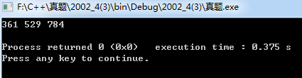 1 #include <stdio.h> 2 #include <stdlib.h> 3 #include<string.h> 4 #include<math.h> 5 int repeat[10];/* 6 repeat数组表示若一个数的第i为位m则repeat[m]=1表示数字m出现过了 用于解决每一组的三个数不能重复 以及 不能与其他组三个数重复的问题》 7 */ 8 int nums[20];//用于存放满足每一组的三个数不能重复且为平方数的条件的三位数 9 10 int f(int n){//判断一个三位数的数字是否重复,若不重复则返回1,反之返回0 11 int flag=1; 12 int t=n; 13 while(t){ 14 if(repeat[t%10]==0){ 15 repeat[t%10]=1; 16 t/=10; 17 }else{ 18 flag=0; 19 break; 20 } 21 } 22 return flag; 23 } 24 25 void f2(int nums[],int count){ 26 //找出在nums中满足数字不重复的三个数 27 int i,j,k; 28 for(i=0;i<count;i++){ 29 memset(repeat,0,sizeof(repeat)); 30 f(nums[i]); 31 for(j=i+1;j<count;j++){ 32 if(f(nums[j])){ 33 for(k=j+1;k<count;k++){ 34 if(f(nums[k])) 35 printf("%d %d %d\n",nums[i],nums[j],nums[k]); 36 } 37 } 38 } 39 } 40 } 41 42 int main() 43 { 44 int i,j; 45 int count=0; 46 for(i=13;i<=31;i++){ 47 memset(repeat,0,sizeof(repeat)); 48 if(f(i*i)){ 49 nums[count++]=i*i; 50 } 51 } 52 f2(nums,count); 53 return 0; 54 }