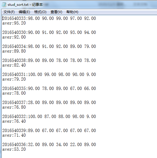 1 #include <stdio.h> 2 #include <stdlib.h> 3 #define M 5 4 #define N 10 5 typedef struct student{ 6 int id; 7 float grades[M]; 8 float average; 9 }STU; 10 11 12 void sort(STU *student,FILE *out){ 13 int i,j; 14 int k; 15 STU t; 16 for(i=0;i<N-1;i++){ 17 k=i; 18 for(j=i+1;j<N;j++){ 19 if(student[k].average<student[j].average) 20 k=j; 21 } 22 if(k!=i){ 23 t=student[k]; 24 student[k]=student[i]; 25 student[i]=t; 26 } 27 } 28 if((out=fopen("stud_sort.txt","w"))==NULL){ 29 printf("Can't open this file.\n"); 30 exit(1); 31 } 32 for(i=0;i<N;i++){ 33 fprintf(out,"%d:",student[i].id); 34 for(j=0;j<M;j++){ 35 fprintf(out,"%0.2f ",student[i].grades[j]); 36 } 37 fprintf(out,"\naver:%0.2f\n\n",student[i].average); 38 } 39 } 40 int main() 41 { 42 FILE *out,*in; 43 STU studetns[N]; 44 int i,j; 45 char buffer[80]; 46 float sum=0.0; 47 if((out=fopen("stud.txt","w+"))==NULL){ 48 printf("Can't open this file.\n"); 49 exit(1); 50 } 51 for(i=0;i<N;i++){ 52 sum=0.0; 53 scanf("%d",&studetns[i].id); 54 fprintf(out,"%d ",studetns[i].id); 55 for(j=0;j<M;j++){ 56 scanf("%f",&studetns[i].grades[j]); 57 sum+=studetns[i].grades[j]; 58 fprintf(out,"%0.2f ",studetns[i].grades[j]); 59 } 60 studetns[i].average=sum/M; 61 fprintf(out,"%0.2f\n",studetns[i].average); 62 } 63 fclose(out); 64 65 if((in=fopen("stud.txt","r"))==NULL){ 66 printf("can't open the file."); 67 exit(1); 68 } 69 for(i=0;i<N;i++){ 70 fscanf(in,"%d",&studetns[i].id); 71 fprintf(stdout,"\nid:%d\ngrades:",studetns[i].id); 72 for(j=0;j<M;j++){ 73 fscanf(in,"%f",&studetns[i].grades[j]); 74 fprintf(stdout,"%0.2f ",studetns[i].grades[j]); 75 } 76 fscanf(in,"%f",&studetns[i].average); 77 fprintf(stdout,"\naver=%0.2f\n",studetns[i].average); 78 } 79 fclose(in); 80 if((out=fopen("stud_sort.txt","w+"))==NULL){ 81 printf("Can't open this file.\n"); 82 exit(1); 83 } 84 sort(studetns,out); 85 fclose(out); 86 87 if((in=fopen("stud_sort.txt","r"))==NULL){ 88 printf("Can't open this file.\n"); 89 exit(1); 90 } 91 fprintf(stdout,"\n\nstud_sort.txt:\n"); 92 for(i=0;i<N;i++){ 93 fscanf(in,"%d",&studetns[i].id); 94 fprintf(stdout,"\nid:%d\ngrades:",studetns[i].id); 95 for(j=0;j<M;j++){ 96 fscanf(in,"%f",&studetns[i].grades[j]); 97 fprintf(stdout,"%0.2f ",studetns[i].grades[j]); 98 } 99 fscanf(in,"%f",&studetns[i].average); 100 fprintf(stdout,"\naver=%0.2f\n",studetns[i].average); 101 } 102 fclose(in); 103 return 0; 104 }