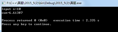 1 #include <stdio.h> 2 #include <stdlib.h> 3 #include<math.h> 4 int Isprime(int num){ 5 int i; 6 int flag=1; 7 8 for(i=2;i*i<=num;i++){ 9 if(num%i==0){ 10 flag=0; 11 break; 12 } 13 } 14 return flag; 15 } 16 17 int main() 18 { 19 int i,n; 20 float sum=0.0; 21 printf("Input n:"); 22 scanf("%d",&n); 23 24 for(i=3;i<=n;i++){ 25 if(Isprime(i)){ 26 sum+=sqrt(i); 27 } 28 } 29 printf("sum=%g\n",sum); 30 return 0; 31 }