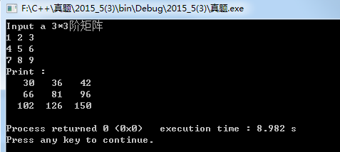 1 #include <stdio.h> 2 #include <stdlib.h> 3 #define M 3 4 int main() 5 { 6 int a[M][M]; 7 static int result[M][M]; 8 int i,j,k; 9 printf("Input a %d*%d阶矩阵\n",M,M); 10 for(i=0;i<M;i++) 11 for(j=0;j<M;j++) 12 scanf("%d",&a[i][j]); 13 14 for(i=0;i<M;i++){ 15 for(j=0;j<M;j++){ 16 for(k=0;k<M;k++){ 17 result[i][j]+=a[i][k]*a[k][j]; 18 } 19 } 20 } 21 22 printf("Print :\n"); 23 for(i=0;i<M;i++){ 24 for(j=0;j<M;j++) 25 printf("%5d",result[i][j]); 26 printf("\n"); 27 } 28 return 0; 29 }