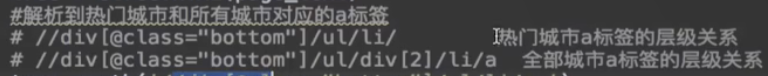 1 import requests 2 3 from lxml import etree 4 5 if __name__=="__main__": 6 url="https://www.aqistudy.cn/historydata/" 7 headers={ 8 'User-Agent':'Mozilla/5.0 (Windows NT 10.0; Win64; x64) AppleWebKit/537.36 (KHTML, like Gecko) Chrome/88.0.4324.104 Safari/537.36' 9 } 10 11 page_text=requests.get(url=url,headers=headers).text 12 13 tree=etree.HTML(page_text) 14 15 li_list=tree.xpath('//div[@class="bottom"]/ul/li | //div[@class="bottom"]/ul/div[2]/li') 16 all_city_names=[] 17 for li in li_list: 18 city_name=li.xpath('./a/text()')[0] 19 all_city_names.append(city_name) 20 21 print(all_city_names)