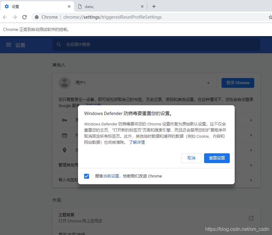selenium启动chrome时,弹出设置页面:Windows Defender 防病毒要重置您的设置。和data页面