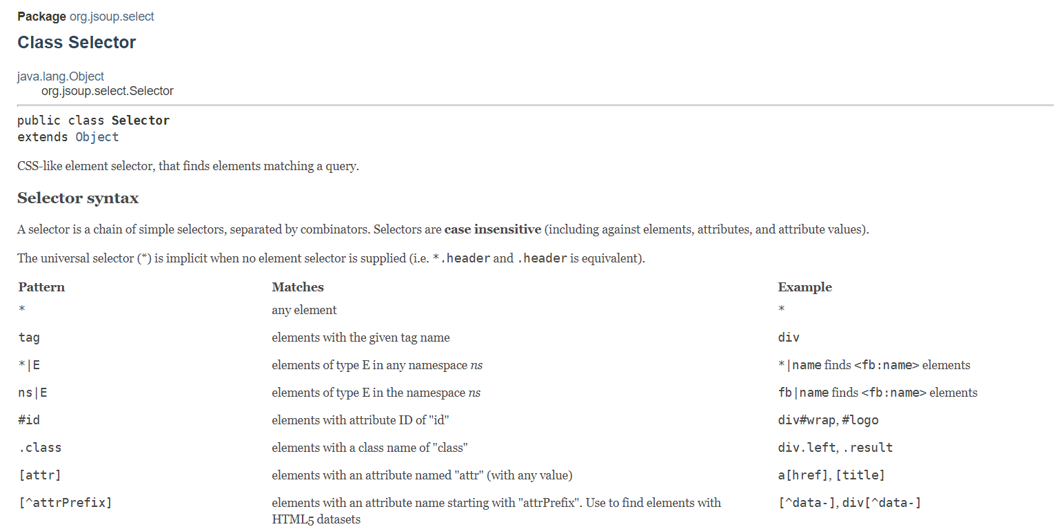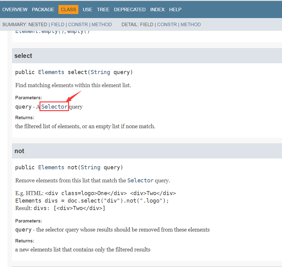 可以不用像之前的那样,一级一级标签进行获取,使用选择器,不记得的可以查阅文档,下载Jsoupdoc.jar然后解压,找到index页面打开,查找能找到具体的使用方法。下面截图: