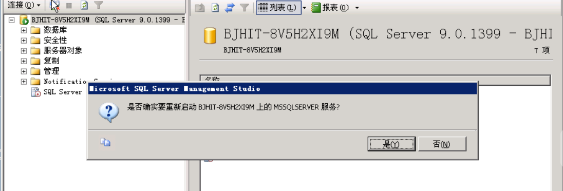 ⑥在“对象资源管理器”中,右击服务器,然后单击“重新启动”,选择是。