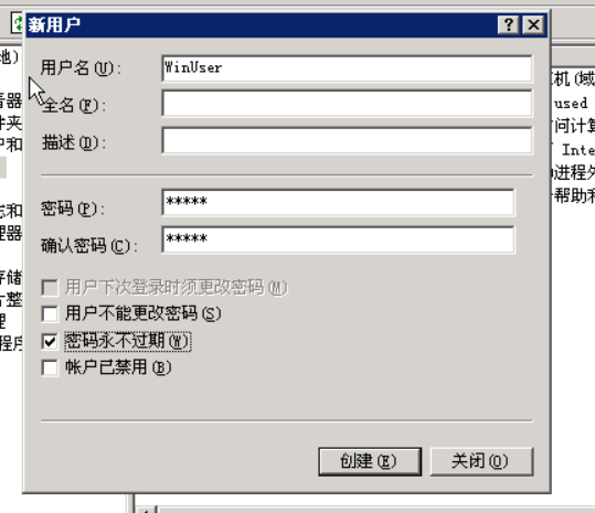 把用户下次登录时须更改密码前面的勾选去掉,把密码永不过期的选项选上,然后点击创建