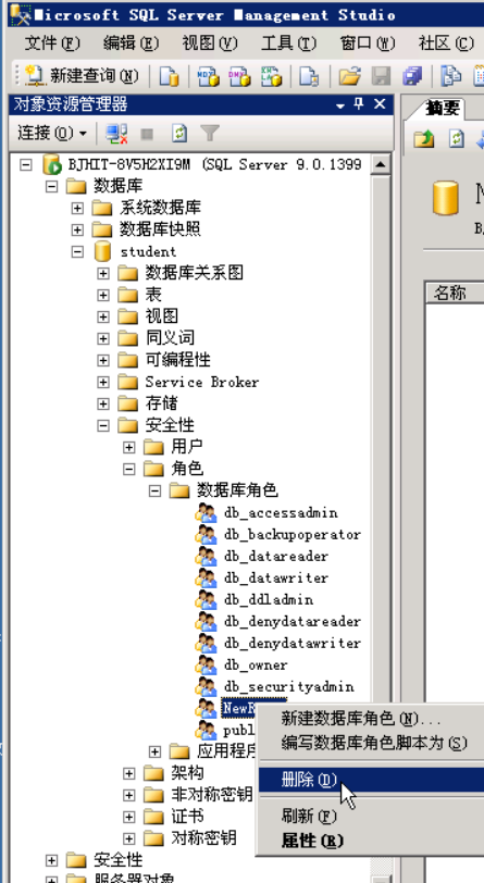 用鼠标右键单击“安全性”节点,从弹出的菜单中选择“新建-数据库角色”命令。