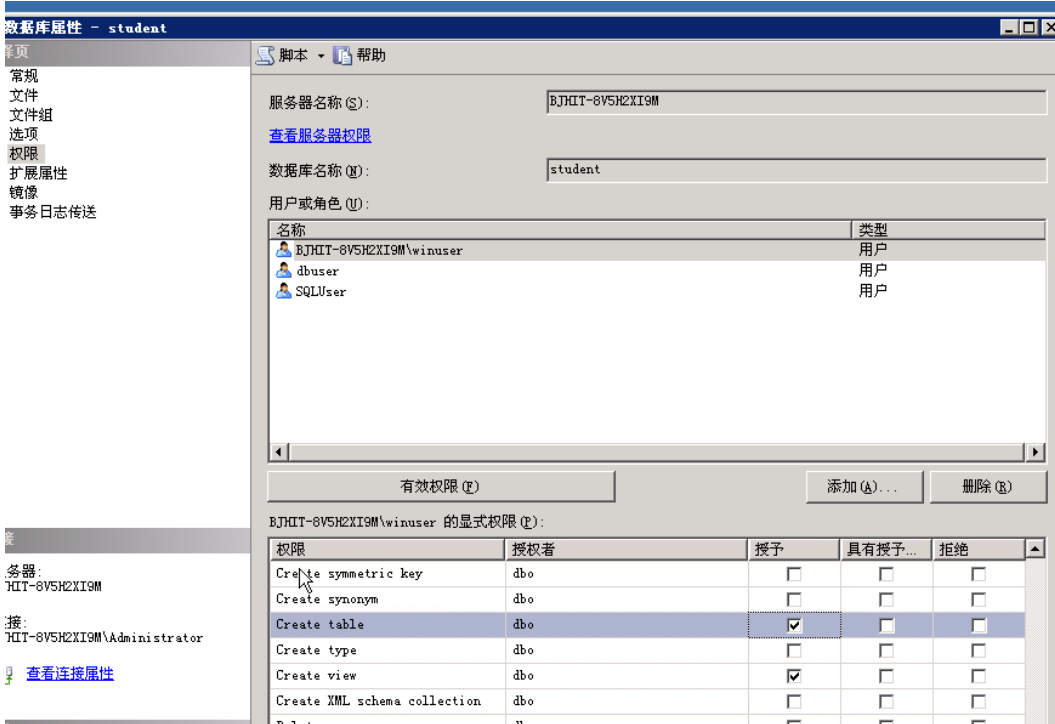 启动SQL Server Management Studio,展开实例数据库,右击student数据库,在弹出的快捷菜单中选择“属性”,然后选择“权限”选项卡。在用户WinUser一栏中,将“创建表”和“创建视图”选中.