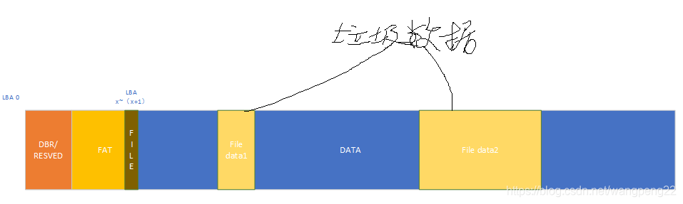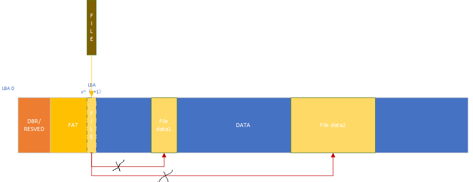 文件创建后如图1:在FAT区保存文件的指针(512B数据),文件数据可能分几个段(如file data1 和 file data2)
