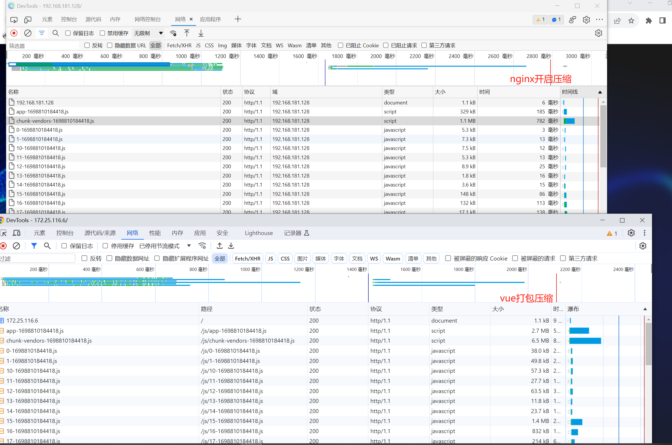 2、使用nginx在线gzip,缺点就是耗性能,需要实时压缩,但是vue打包后的文件体积小。