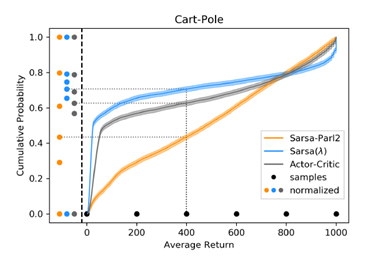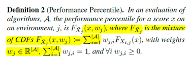 如图所示,左边这些点就是被映射到[0,1]区间上了,然后作者的意思是每个环境都可以这样映射过来,那么环境的得分就被统一了。然后要评价一个算法,就把每个环境的CDF加权求和就可以了。