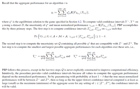 接下来就是计算置信区间,也就是performance bound propagation(PBP)来量化评估过程的不确定性。大概思路就是,对每个环境先算置信区间,根据这个置信区间来找满足条件的\((p^*,q^*)\),就可以求performance percentiles了,然后找他们的下界和上界。具体做法见论文附录: