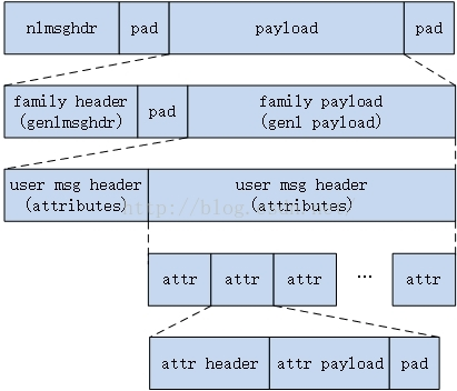 1 /* ======================================================================== 2 * Netlink Messages and Attributes Interface (As Seen On TV) 3 * ------------------------------------------------------------------------ 4 * Messages Interface 5 * ------------------------------------------------------------------------ 6 * 7 * Message Format: 8 * <--- nlmsg_total_size(payload) ---> 9 * <-- nlmsg_msg_size(payload) -> 10 * +----------+- - -+-------------+- - -+-------- - - 11 * | nlmsghdr | Pad | Payload | Pad | nlmsghdr 12 * +----------+- - -+-------------+- - -+-------- - - 13 * nlmsg_data(nlh)---^ ^ 14 * nlmsg_next(nlh)-----------------------+ 15 * 16 * Payload Format: 17 * <---------------------- nlmsg_len(nlh) ---------------------> 18 * <------ hdrlen ------> <- nlmsg_attrlen(nlh, hdrlen) -> 19 * +----------------------+- - -+--------------------------------+ 20 * | Family Header | Pad | Attributes | 21 * +----------------------+- - -+--------------------------------+ 22 * nlmsg_attrdata(nlh, hdrlen)---^ 23 * 24 * Data Structures: 25 * struct nlmsghdr netlink message header 26 */