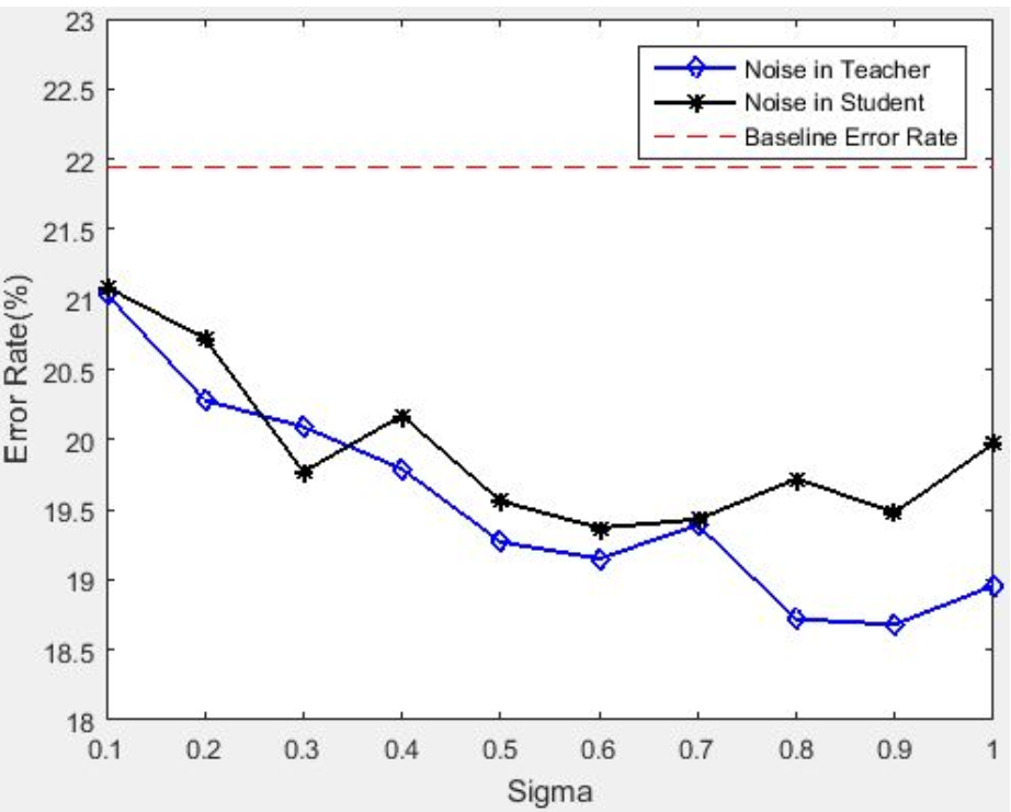 Noisy Teacher指对部分Teacher Network的logits加入噪声以进行扰动。在实验3.3中, $ \sigma $为变量,在此处,将 $ \sigma \(固定,调节\) \alpha$,相关结果如下: