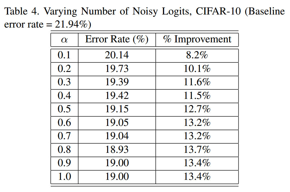 令\(\sigma\)表示the amount of perturbation on the teacher’s original logit values \(z'^{(i)}\)。注意, 这种扰动并未施加在全部样本上。令\(\alpha\)表示一个固定的概率,并以此概率在mini-batch中随机选择样本以\((2)\)式进行扰动。