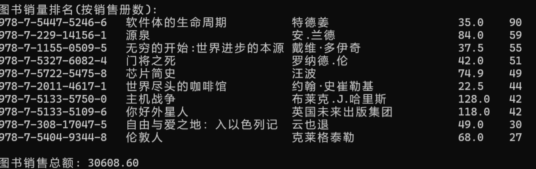 1 #include <stdio.h> 2 #define N 10 3 4 typedef struct { 5 char isbn[20]; 6 char name[80]; 7 char author[80]; 8 double sales_price; 9 int sales_count; 10 } Book; 11 12 void output(Book x[], int n); 13 void sort(Book x[], int n); 14 double sales_amount(Book x[], int n); 15 16 int main() { 17 Book x[N] = { {"978-7-5327-6082-4", "门将之死", "罗纳德.伦", 42, 51}, 18 {"978-7-308-17047-5", "自由与爱之地:入以色列记", "云也退", 49 , 30}, 19 {"978-7-5404-9344-8", "伦敦人", "克莱格泰勒", 68, 27}, 20 {"978-7-5447-5246-6", "软件体的生命周期", "特德姜", 35, 90}, 21 {"978-7-5722-5475-8", "芯片简史", "汪波", 74.9, 49}, 22 {"978-7-5133-5750-0", "主机战争", "布莱克.J.哈里斯", 128, 42}, 23 {"978-7-2011-4617-1", "世界尽头的咖啡馆", "约翰·史崔勒基", 22.5, 44}, 24 {"978-7-5133-5109-6", "你好外星人", "英国未来出版集团", 118, 42}, 25 {"978-7-1155-0509-5", "无穷的开始:世界进步的本源", "戴维·多伊奇", 37.5, 55}, 26 {"978-7-229-14156-1", "源泉", "安.兰德", 84, 59} }; 27 28 printf("图书销量排名(按销售册数): \n"); 29 sort(x, N); 30 output(x, N); 31 32 printf("\n图书销售总额: %.2f\n", sales_amount(x, N)); 33 34 return 0; 35 } 36 37 38 void output(Book x[], int n) { 39 for (int i = 0; i < n; i++) { 40 printf("%-20s%-26s%-20s\t%0.1lf\t%d\n", x[i].isbn, x[i].name, x[i].author, x[i].sales_price, x[i].sales_count); 41 } 42 } 43 44 45 void sort(Book x[], int n) { 46 Book t; 47 for (int i = 0; i < n ; i++) { 48 for (int j = 0; j < n - 1 - i; j++) { 49 if (x[j].sales_count < x[j + 1].sales_count) { 50 t = x[j]; 51 x[j] = x[j + 1]; 52 x[j + 1] = t; 53 } 54 } 55 } 56 } 57 58 double sales_amount(Book x[], int n) { 59 double ans = 0; 60 for (int i = 0; i < n; i++) { 61 ans += x[i].sales_count * x[i].sales_price; 62 } 63 return ans; 64 }