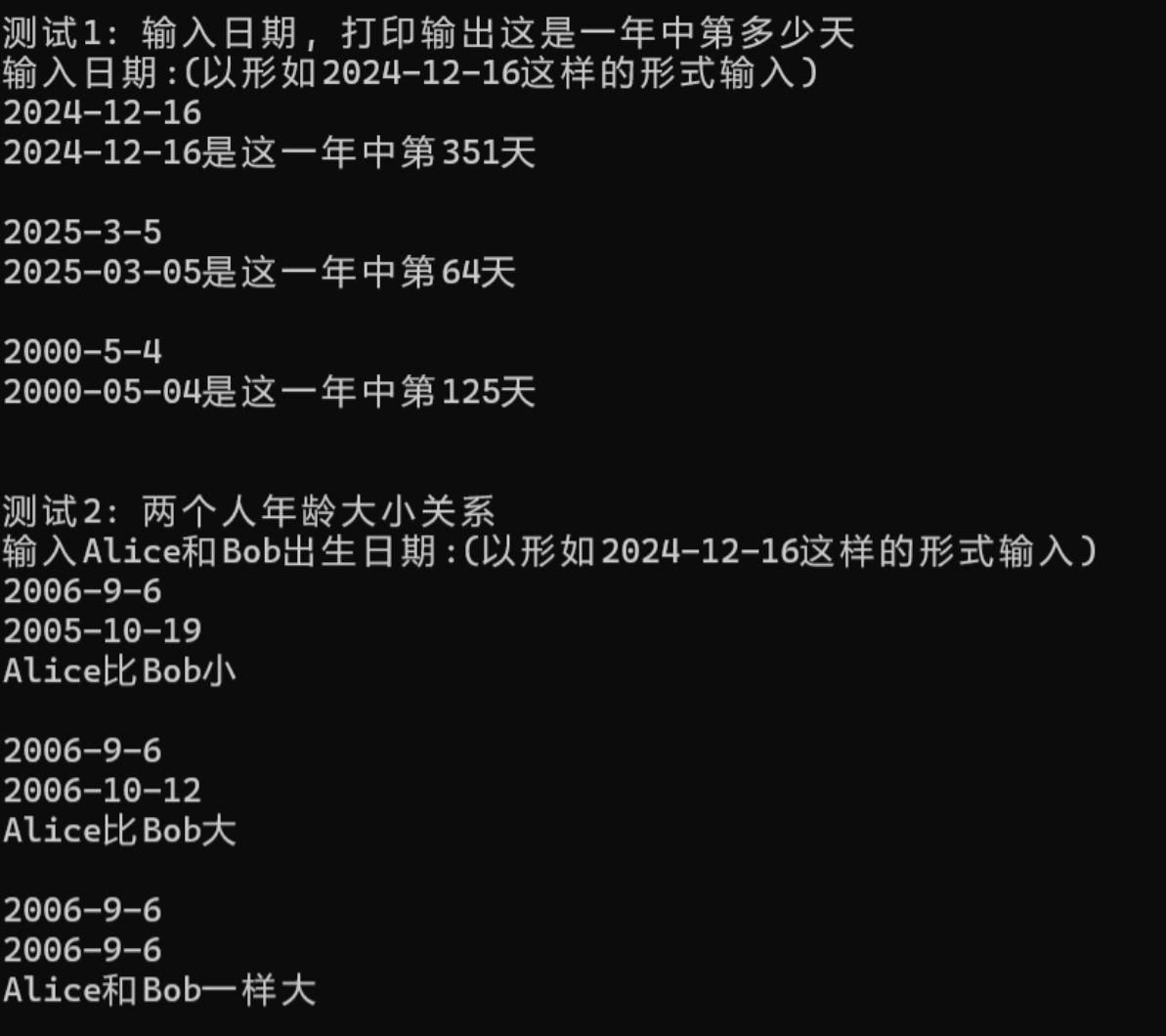 1 #include <stdio.h> 2 3 typedef struct { 4 int year; 5 int month; 6 int day; 7 } Date; 8 9 void input(Date* pd); 10 int day_of_year(Date d); 11 int compare_dates(Date d1, Date d2); // 比较两个日期: 12 13 14 void test1() { 15 Date d; 16 int i; 17 18 printf("输入日期:(以形如2024-12-16这样的形式输入)\n"); 19 for (i = 0; i < 3; ++i) { 20 input(&d); 21 printf("%d-%02d-%02d是这一年中第%d天\n\n", d.year, d.month, d.day, day_of_year(d)); 22 } 23 } 24 25 void test2() { 26 Date Alice_birth, Bob_birth; 27 int i; 28 int ans; 29 30 printf("输入Alice和Bob出生日期:(以形如2024-12-16这样的形式输入)\n"); 31 for (i = 0; i < 3; ++i) { 32 input(&Alice_birth); 33 input(&Bob_birth); 34 ans = compare_dates(Alice_birth, Bob_birth); 35 36 if (ans == 0) 37 printf("Alice和Bob一样大\n\n"); 38 else if (ans == -1) 39 printf("Alice比Bob大\n\n"); 40 else 41 printf("Alice比Bob小\n\n"); 42 } 43 } 44 45 int main() { 46 printf("测试1: 输入日期, 打印输出这是一年中第多少天\n"); 47 test1(); 48 49 printf("\n测试2: 两个人年龄大小关系\n"); 50 test2(); 51 } 52 53 void input(Date* pd) { 54 55 scanf("%d-%d-%d", &pd->year, &pd->month, &pd->day); 56 } 57 58 int day_of_year(Date d) { 59 60 int days[2][12] = { 61 { 31,28,31,30,31,30,31,31,30,31,30,31 }, 62 { 31,29,31,30,31,30,31,31,30,31,30,31 } 63 }; 64 int day = 0; 65 day += d.day; 66 int y = d.month; 67 for (int i = 0; i < y - 1; i++) { 68 day += days[(d.year % 4 == 0 && d.year % 100 != 0 || d.year % 400 == 0) ? (1) : (0)][i]; 69 } 70 return day; 71 } 72 73 int compare_dates(Date d1, Date d2) { 74 75 if (d1.year > d2.year) { 76 return 1; 77 } 78 else if (d1.year < d2.year) { 79 return -1; 80 } 81 else { 82 if (d1.month > d2.month) { 83 return 1; 84 } 85 else if (d1.month < d2.month) { 86 return -1; 87 } 88 else { 89 if (d1.day > d2.day) { 90 return 1; 91 } 92 else if (d1.day < d2.day) { 93 return -1; 94 } 95 else { 96 return 0; 97 } 98 } 99 } 100 }
