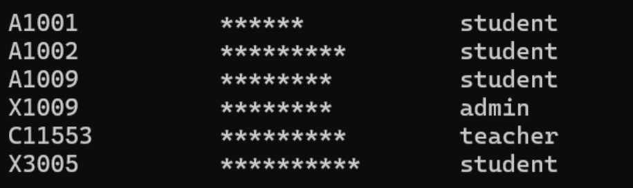 1 #include <stdio.h> 2 #include <string.h> 3 4 enum Role { admin, student, teacher }; 5 char chars[3][8] = { 6 "admin", 7 "student", 8 "teacher" 9 }; 10 typedef struct { 11 char username[20]; 12 char password[20]; 13 enum Role type; 14 } Account; 15 16 17 18 void output(Account x[], int n); 19 20 int main() { 21 Account x[] = { {"A1001", "123456", student}, 22 {"A1002", "123abcdef", student}, 23 {"A1009", "xyz12121", student}, 24 {"X1009", "9213071x", admin}, 25 {"C11553", "129dfg32k", teacher}, 26 {"X3005", "921kfmg917", student} }; 27 int n; 28 n = sizeof(x) / sizeof(Account); 29 output(x, n); 30 31 return 0; 32 } 33 34 void output(Account x[], int n) { 35 36 for (int i = 0; i < n; i++) { 37 printf("%-15s", x[i].username); 38 for (int j = 0; j < strlen(x[i].password); j++) { 39 printf("*"); 40 } 41 for (int j = 0; j < (15 - strlen(x[i].password)); j++) { 42 printf(" "); 43 } 44 printf("\t%s\n", chars[x[i].type]); 45 } 46 47 }