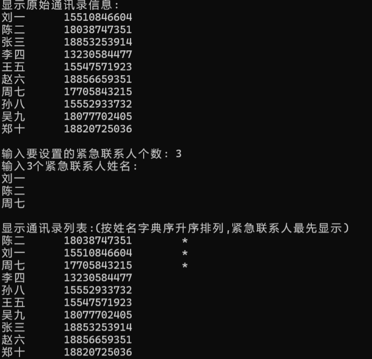 1 #include <stdio.h> 2 #include <string.h> 3 4 typedef struct { 5 char name[20]; 6 char phone[12]; 7 int vip; 8 } Contact; 9 10 11 void set_vip_contact(Contact x[], int n, char name[]); 12 void output(Contact x[], int n); 13 void display(Contact x[], int n); 14 15 #define N 10 16 int main() { 17 Contact list[N] = { {"刘一", "15510846604", 0}, 18 {"陈二", "18038747351", 0}, 19 {"张三", "18853253914", 0}, 20 {"李四", "13230584477", 0}, 21 {"王五", "15547571923", 0}, 22 {"赵六", "18856659351", 0}, 23 {"周七", "17705843215", 0}, 24 {"孙八", "15552933732", 0}, 25 {"吴九", "18077702405", 0}, 26 {"郑十", "18820725036", 0} }; 27 int vip_cnt, i; 28 char name[20]; 29 30 printf("显示原始通讯录信息: \n"); 31 output(list, N); 32 33 printf("\n输入要设置的紧急联系人个数: "); 34 scanf("%d", &vip_cnt); 35 36 printf("输入%d个紧急联系人姓名:\n", vip_cnt); 37 for (i = 0; i < vip_cnt; ++i) { 38 scanf("%s", name); 39 set_vip_contact(list, N, name); 40 } 41 42 printf("\n显示通讯录列表:(按姓名字典序升序排列,紧急联系人最先显示)\n"); 43 display(list, N); 44 45 return 0; 46 } 47 48 void set_vip_contact(Contact x[], int n, char name[]) { 49 50 for (int i = 0; i < n; i++) { 51 if (strcmp(x[i].name,name) == 0) { 52 x[i].vip = 1; 53 } 54 } 55 } 56 57 58 void display(Contact x[], int n) { 59 60 Contact t; 61 for (int i = 0; i < n; i++) { 62 for (int j = 0; j < n - 1 - i; j++) { 63 if (strcmp(x[j].name, x[j + 1].name) > 0) { 64 t = x[j]; 65 x[j] = x[j + 1]; 66 x[j + 1] = t; 67 } 68 } 69 } 70 for (int i = 0; i < n; i++) { 71 if (x[i].vip) { 72 printf("%-10s%-15s", x[i].name, x[i].phone); 73 if (x[i].vip) 74 printf("%5s", "*"); 75 printf("\n"); 76 } 77 } 78 for (int i = 0; i < n; i++) { 79 if (!x[i].vip) { 80 printf("%-10s%-15s", x[i].name, x[i].phone); 81 if (x[i].vip) 82 printf("%5s", "*"); 83 printf("\n"); 84 } 85 } 86 } 87 88 void output(Contact x[], int n) { 89 int i; 90 91 for (i = 0; i < n; ++i) { 92 printf("%-10s%-15s", x[i].name, x[i].phone); 93 if (x[i].vip) 94 printf("%5s", "*"); 95 printf("\n"); 96 } 97 }
