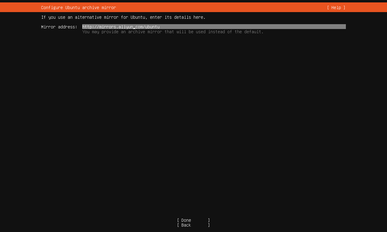 14.镜像地址是将来安装完成后软件更新的地址,优先选择国内的,配置为 http://mirrors.aliyun.com/ubuntu/