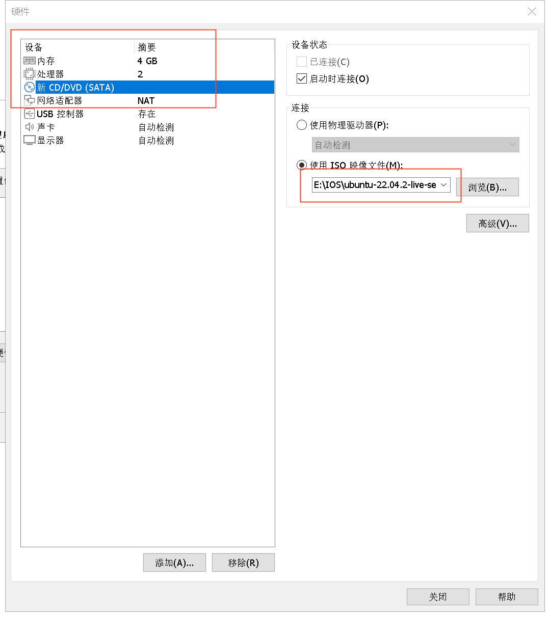 6.调整硬件配置,选择DVD启动映像文件为刚才下载的ubuntu-22.04.2-live-server-amd64.iso